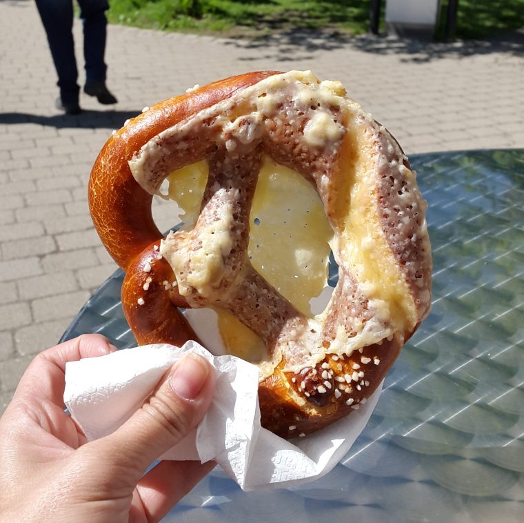 Na cervejaria é servido pratos típicos da Alemanha como joelho de porco, salsichas, saladas de batata e chucrutes. Não tenho nenhuma foto de pratos porque chegamos depois das 22h. Em todos os lugares que fomos em Munique eram assim, param de servir comida neste horário. E, às 23h, não servem mais cerveja. Para quem fica batendo perna até 21h (quando começa a escurecer por lá no horário de verão), 22h está cedo demais. Tivemos que ir adaptando e passamos a voltar mais cedo dos passeios. Nossa sorte é que passaram umas vendedoras de pretzel (pão tradicional por lá), igual passa por aqui os vendedores de amendoim. Salvou a noite!