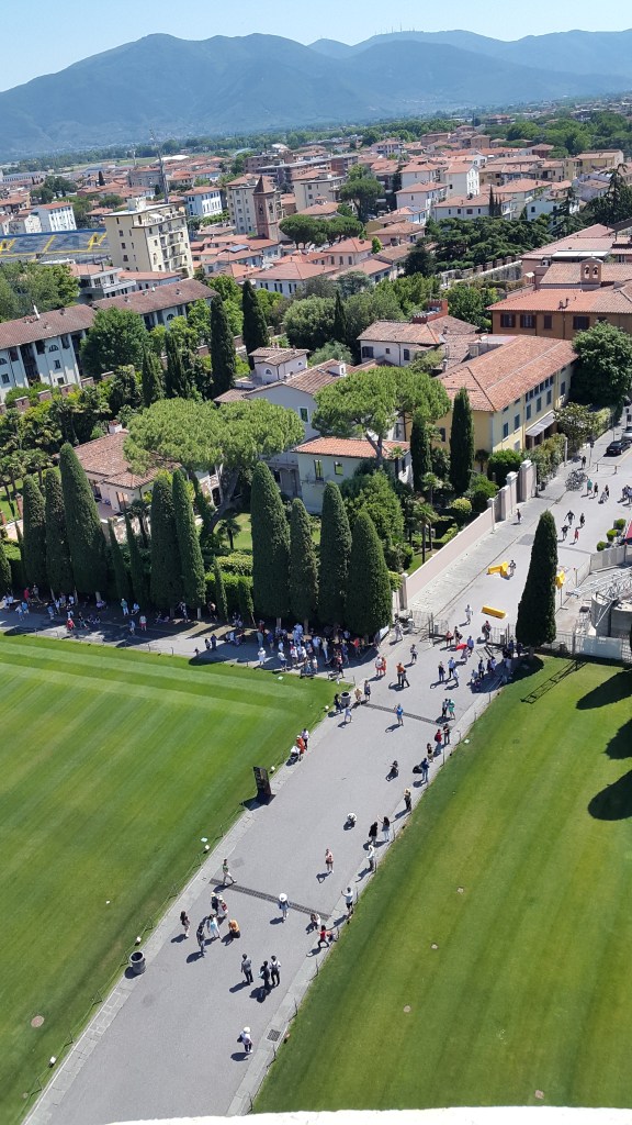 Chegando no topo: É uma mistura de encantamento com desespero. Encantamento porque Pisa lá de cima é linda! Ninguém pensa na cidade, só lembra da torre. Deve ser ótima para morar, um sossego! E o desespero é porque você vai andando em volta do topo e caindo pro lado. Fui dar uns 10 passos direto e fui parar na grade, com as pernas tremendo. Que sensação horrível! Parei. Fui ver os sinos gigantes que ficam no centro do topo, lá é mais reto! Não recomendo para quem tem um pouquinho de medo de coisas diferentes. É uma aventura!