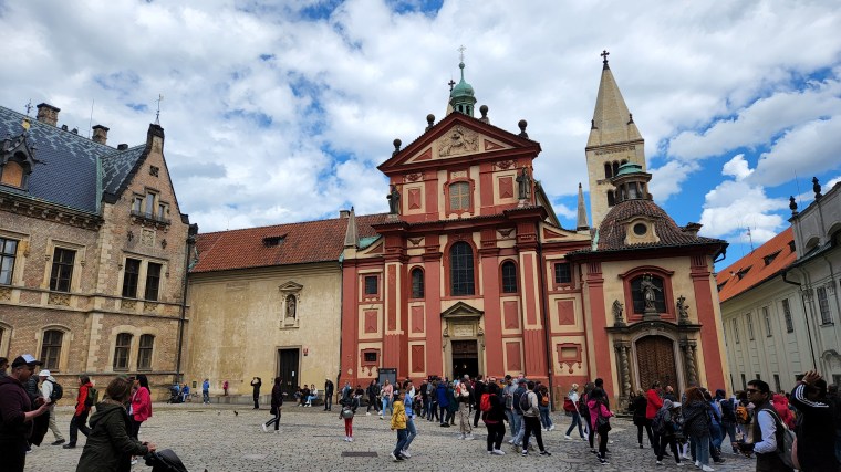 Basílica de São Jorge: já foi vários estilos, romano do século 10, gótico do século 14 etc. Hoje, é a mais bem preservada igreja romanesca de Praga, datada de 920, mas ganhou uma fachada barroca 5 séculos depois – o estilo romanesco ficou só no interior. A igreja apresenta concertos de música clássica quase todos os dias.