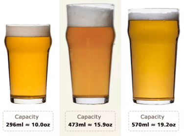 O nome “pint” vem da medida de volume britânica, equivalente a 568 ml, nos Estados Unidos, essa medida é de 473ml (medida do nosso latão). Existem variações do copo pint, como o “nonic pint”, que tem uma saliência na parte superior para facilitar o empilhamento e evitar quebrar as bordas. E o Half Pint (o meu preferido), é o que cabe a metade da medida do pint, normalmente, 285ml (na figura ao lado, a medida está errada).