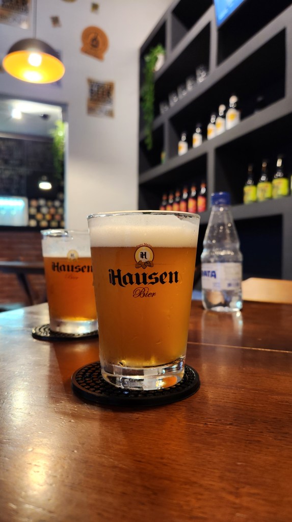 O biergarten conta 10 com torneiras de chope artesanal, da Hausen Bier, oferecendo uma variedade de estilos para atender aos diferentes paladares. Quando estive lá, estavam engatados nove chopes. Se liga na variedade: Pilsen, Hop Lager, Weiss, Vienna, Dunkel, Oktoberfest, APA 7 lúpulos, IPA, New England IPA.