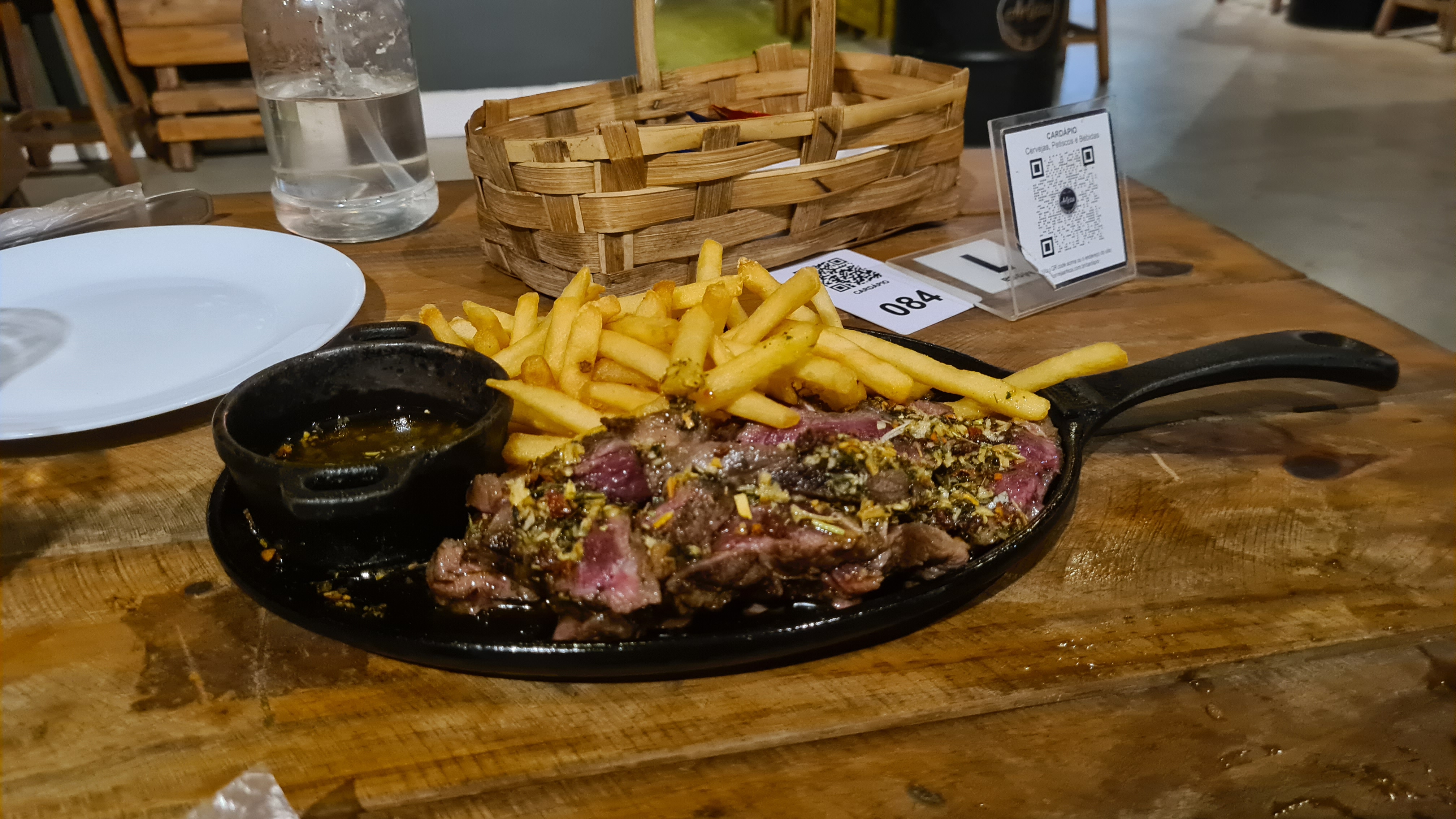Prato: Picanha suína (350g), batata rústica, salsa Crioulla e azeite saborizado com crispy de Couve.