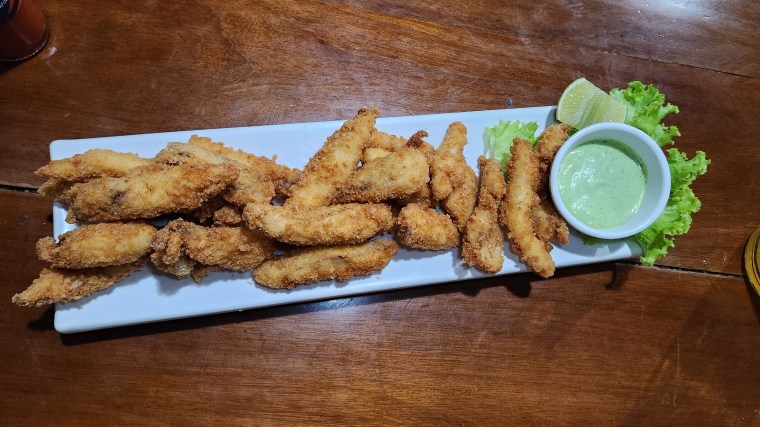 Prato: Iscas de tilápia empanadas na farinha moinho e parmesão. Acompanha molho de queijo Minas.