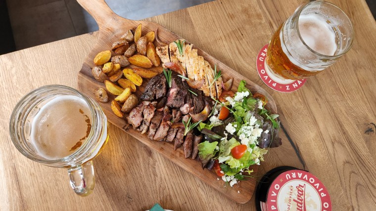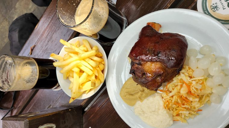 O restaurante também é reconhecido pela renomeada cozinha da Boêmia antiga, com pratos típicos tchecos e algumas opções vegetarianas. A comida é servida super rápido e é muito gostosa! Nós pedimos pescoço de porco defumado, com salpicão, mostarda, um molho de raiz-forte, cebola em conserva e pão. E pedimos babata frita a parte.