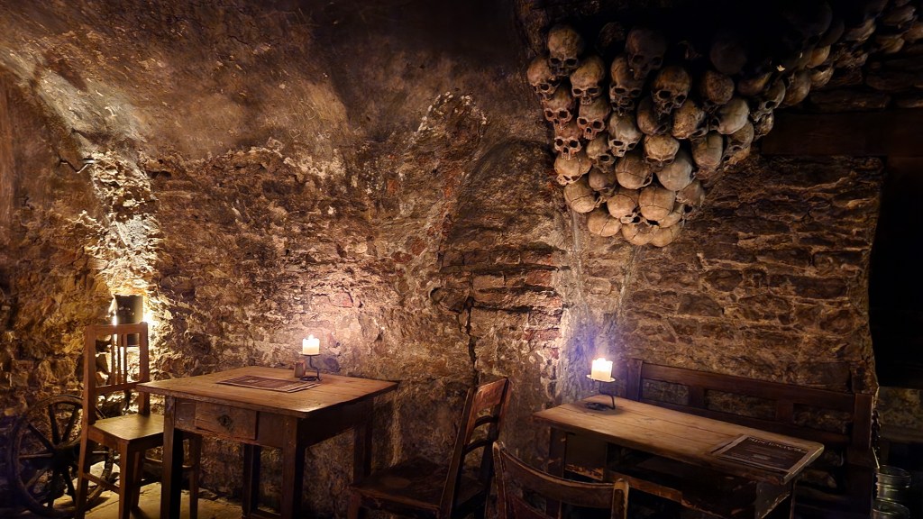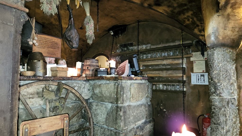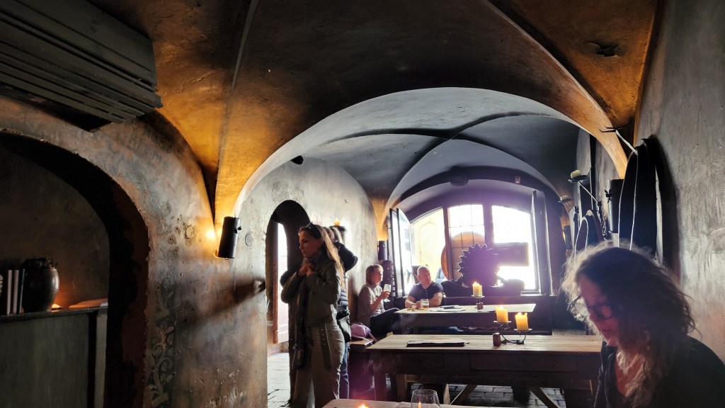 No labirinto subterrâneo, a casa proporciona uma experiência autêntica de festa medieval com música, dança e show de malabaristas. Essa apresentação acontece em alguns dias da semana. Dizem que é muito legal. Não tivemos a oportunidade de assistir, pois, na “agenda” que fiz, só dava para ir lá no almoço, pois as noites já estavam preenchidas com lugares que só abriam à noite.