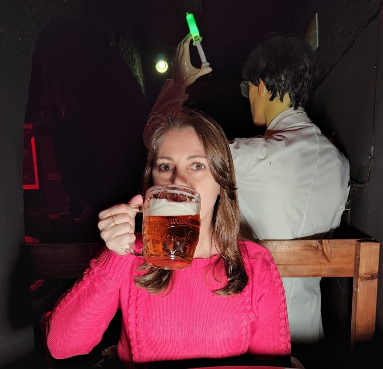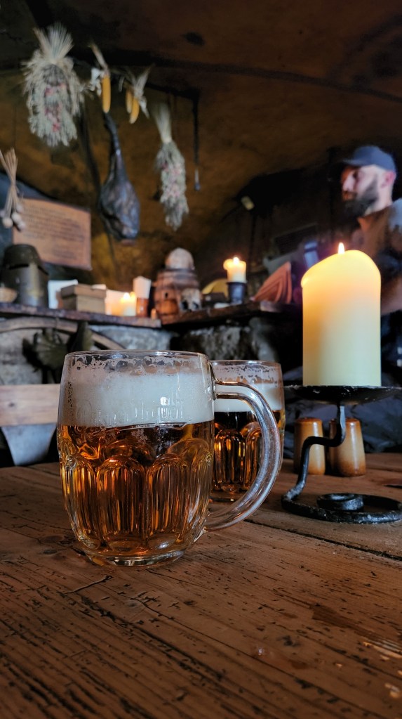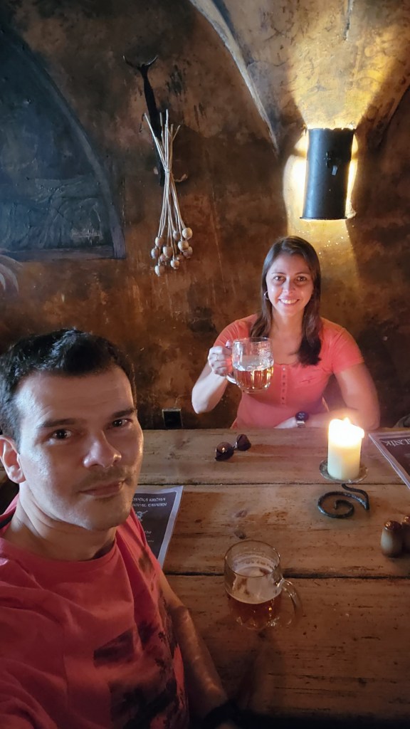 A atmosfera toda ali conspira para que você se transporte para outro século! Todos os garçons estão vestidos a caráter e, para servir, é igual na era medieval mesmo. O primeiro chope que você pede, o garçom vem trazer a caneca e joga com força na sua mesa, como se estivesse com raiva. Eu levei um susto! A garçonete deu uma risadinha, deve ser para eu entender que aquilo fazia parte da experiência. Os demais chopes eles traziam e batiam na mesa e viravam as costas sem tanta violência…rs. Foi divertido!