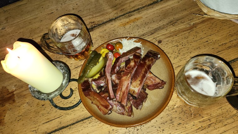 Os pratos são variados, a maioria inspirados em pratos típicos do país. Nós pedimos costela de porco defumada com mostarda e raiz forte, que veio acompanhada de pimenta, tomatinho e picles (que aparece em todos os pratos típicos de lá). É farto, o suficiente para dois.
