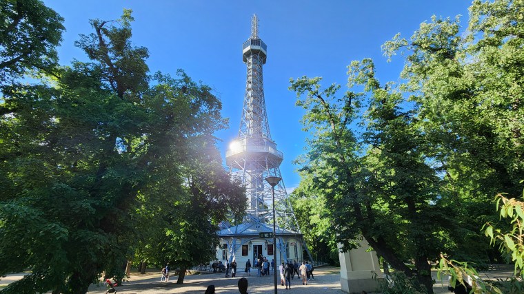 Eu falo da Torre Petřín (Petřínská rozhledna), conhecida como a Torre Eiffel de Praga. É o mirante mais elevado de Praga. Do seu terraço superior, a 51 metros de altura, você estará a 200 metros de altitude do rio Moldava.