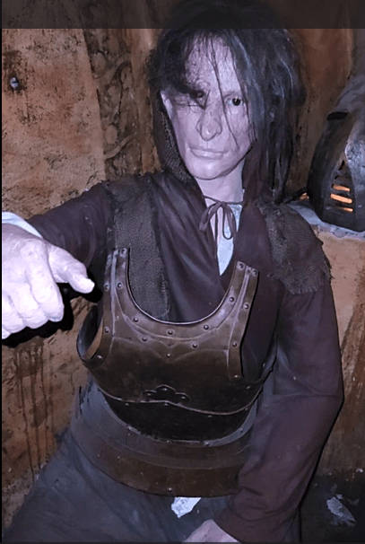 Pensa em uma taverna de um filme medieval. É exatamente o que vimos lá. Já começando pela porta, onde fica um boneco, numa espécie de porão com o braço na rua, parecendo pedir ajuda.