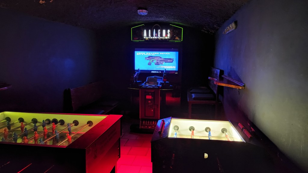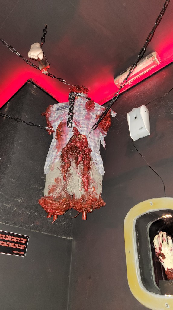 Em todo canto que você olha tem algum adereço como mãos sangrando, “pedaços de corpos”, quadro com pôster de filme de terror e personagens de filmes em tamanho real Até o banheiro é cabuloso. Pode tirar foto de tudo, só não pode mexer.