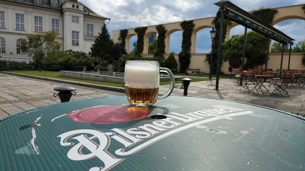 Como ganhamos um chope na Urquell por ter comprado o ingresso da cidade subterrânea, paramos no restaurante da Urquell, uma espécie de biergarten da fábrica e aproveitamos para tomar mais Urquell.