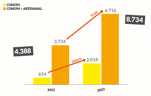 Outro destaque no estudo sobre a indústria cervejeira no Brasil é o total de registros de produtos: 45.648, com crescimento de 6,6% em relação a 2022, ou seja, 2.817 registros a mais em um ano. Com esses números, a cerveja segue como a bebida mais registrada no país.