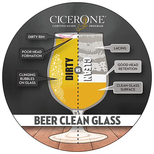 O Programa de Certificação Cicerone® é uma organização norte-americana, concebida e liderada por Ray Daniels, que se dedica ao ensino e certificação de profissionais do ramo cervejeiro. Um dos segmentos de ensino do programa é o de como fazer um bom serviço da cerveja. Um dos pontos abordados durante a aula de serviço é como limpar e armazenar os copos. Abaixo segue uma imagem elaborada pela instituição sobre as causas e efeitos que um copo sujo pode ter sobre a cerveja.