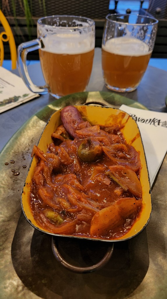 Voltando no U Pavouka, o cardápio conta com refeições tradicionais tchecas como goulash de carne ou de javali, joelho de porco assado, pato assado com couve e bolinhos e muito mais. Pedimos de entrada o Roast sausages on black beer (salsichas assadas na cerveja preta) e os pratos principais foram Beef goulash adorned with vienesse onions, bread dumplings (Goulash de carne adornado com cebolas vienesse, bolinhos de pão) e 1/4 duck baked with apple-flavoured red cabbage, mixed dumplings (1/4 pato assado com repolho roxo com sabor de maçã, bolinhos mistos). Esses bolinhos são bem comuns nos pratos tchecos.