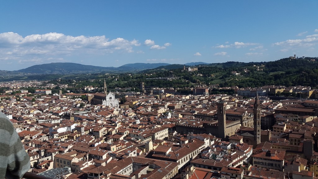Chegando no topo: É uma mistura de encantamento com desespero. Encantamento porque Pisa lá de cima é linda! Ninguém pensa na cidade, só lembra da torre. Deve ser ótima para morar, um sossego! E o desespero é porque você vai andando em volta do topo e caindo pro lado. Fui dar uns 10 passos direto e fui parar na grade, com as pernas tremendo. Que sensação horrível! Parei. Fui ver os sinos gigantes que ficam no centro do topo, lá é mais reto! Não recomendo para quem tem um pouquinho de medo de coisas diferentes. É uma aventura!