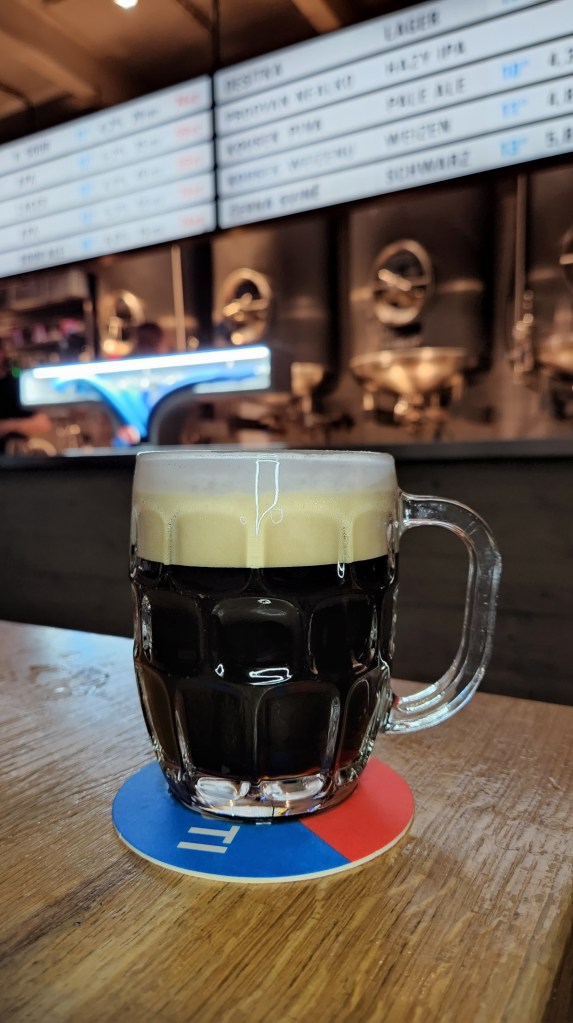 Quando eu vi que existia um bar dentro de uma fábrica de cerveja, logo me animei. Mas isso, é comum por aqui no Brasil. Os nossos famosos Brewpubs, onde a fábrica fica no mesmo espaço do bar. Mas, normalmente, aqui, as cervejas são tiradas dos fermentadores, passadas para um barril, que ficam na câmara fria para serem servidos em uma torneira separada. E os locais onde bebemos é um bar ou restaurante, mais de boa, e sem muita aproximação dos tanques.