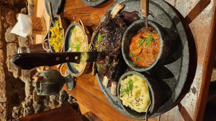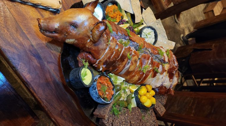 O restaurante também é reconhecido pela renomeada cozinha da Boêmia antiga, com pratos típicos tchecos e algumas opções vegetarianas. A comida é servida super rápido e é muito gostosa! Nós pedimos pescoço de porco defumado, com salpicão, mostarda, um molho de raiz-forte, cebola em conserva e pão. E pedimos babata frita a parte.